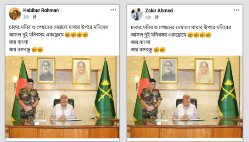 সম্প্রতি অন্তর্বর্তীকালীন সরকারের প্রধান উপদেষ্টা ড. মুহাম্মদ ইউনূস ও সেনাপ্রধান জেনারেল ওয়াকার-উজ-জামানের ছবি দাবিতে ‘চাকর,মনিব ও পেছনের দেয়ালে মাথার উপরে মনিবের আসল দুই মনিবসহ একফ্রেমে’ ক্যাপশনে একটি ছবি সামাজিক যোগাযোগ মাধ্যমে প্রচার করা হয়েছে।