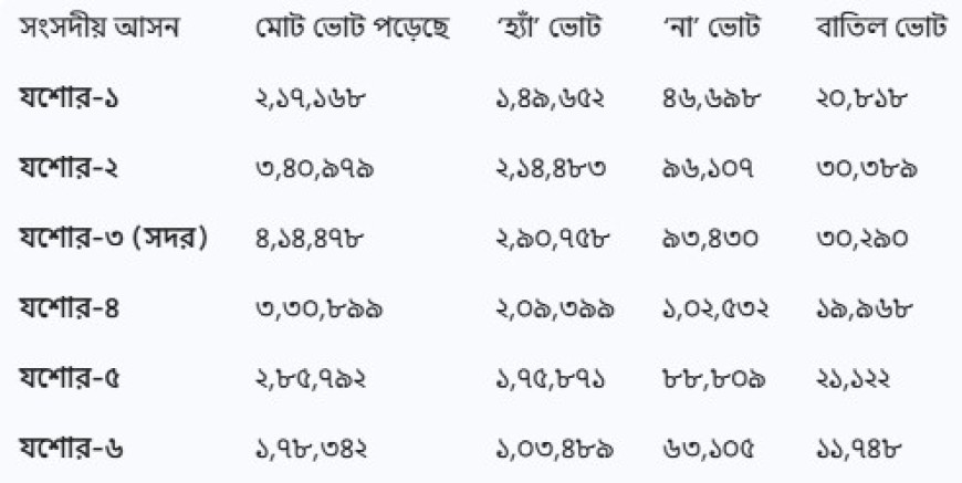 যশোর জেলার ৬টি সংসদীয় আসনে সাড়ে ১১ লাখ ভোট পেয়ে ‘হ্যাঁ’ জয়লাভ করেছে। তবে জেলাজুড়ে প্রায় ৫ লাখ ‘না’ ভোট এবং দেড় লাখের মতো ভোট বাতিল হওয়ায় জনমনে ব্যাপক কৌতূহল সৃষ্টি হয়েছে। বিপুল পরিমাণ ‘না’ ভোট পড়ায় অনেকেই হতবাক হলেও জুলাই বিপ্লবের চেতনা ও রাষ্ট্র সংস্কারের পক্ষে ‘হ্যাঁ’ জয়ী হওয়ায় ভোটাররা আশাবাদী যে, নবনির্বাচিত সংসদ সদস্যদের মাধ্যমে নতুন সংস্কার বাস্তবায়িত হবে।