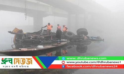 ❒ ঝিনাইদহের শৈলকূপায় সেতুর রেলিং ভেঙে কুমার নদীতে পড়ে গেছে একটি পণ্যবাহী ট্রাক ছবি: সংগৃহীত