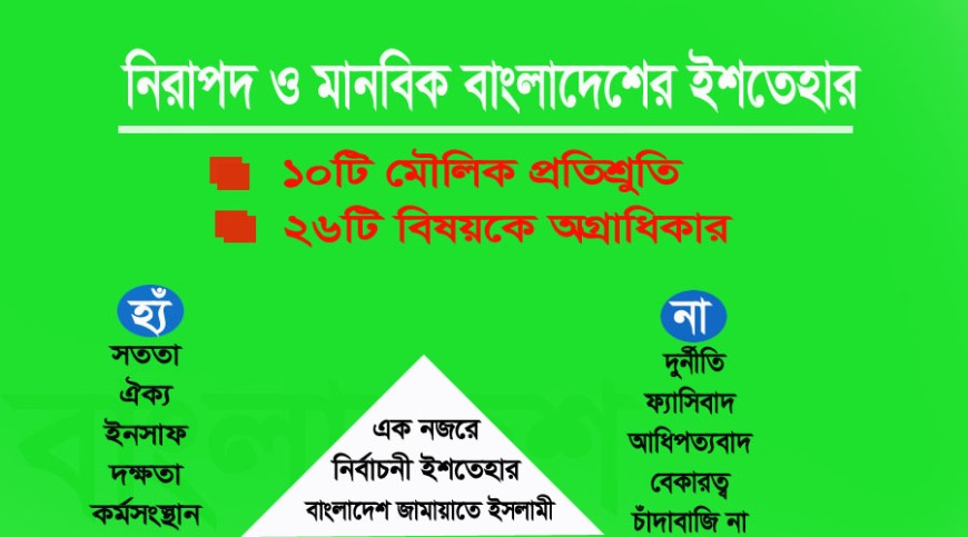 নির্বাচনী ইশতেহার ঘোষণা করেছে জামায়াতে ইসলামী যার মধ্যে ১০টি মৌলিক প্রতিশ্রুতি এবং ২৬টি বিষয়কে অগ্রাধিকার দেওয়ার কথা বলা হয়েছে। ছবি: সংগৃহীত