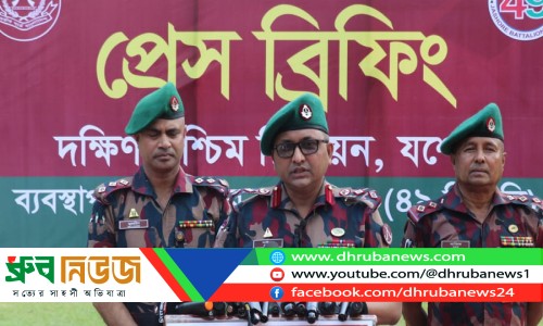 সংবাদ সম্মেলনে যশোর ৪৯ বিজিবি ব্যাটালিয়নের কমান্ডিং অফিসার লে. কর্নেল গোলাম মোহাম্মদ সাইফুল আলম খান ছবি: ধ্রুব নিউজ