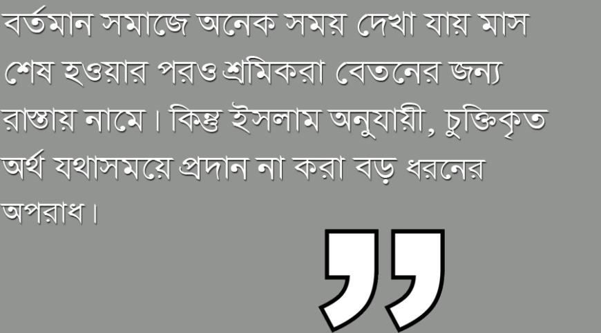 বর্তমান সমাজে অনেক সময় দেখা যায় মাস শেষ হওয়ার পরও শ্রমিকরা বেতনের জন্য রাস্তায় নামে। কিন্তু ইসলাম অনুযায়ী, চুক্তিকৃত অর্থ যথাসময়ে প্রদান না করা বড় ধরনের অপরাধ। হাদীসে কুদসীতে আছে, আল্লাহ তাআলা ঘোষণা করেন— কিয়ামতের দিন তিনি স্বয়ং সেই ব্যক্তির বিরুদ্ধে অভিযোগকারী হবেন, যে কোনো শ্রমিককে নিয়োগ দিয়ে কাজ বুঝে নেওয়ার পরও তার পাওনা পরিশোধ করেনি। যার বিপক্ষে স্বয়ং স্রষ্টা দাঁড়াবেন, তার বিচার যে কত ভয়াবহ হবে তা সহজেই অনুমেয়।