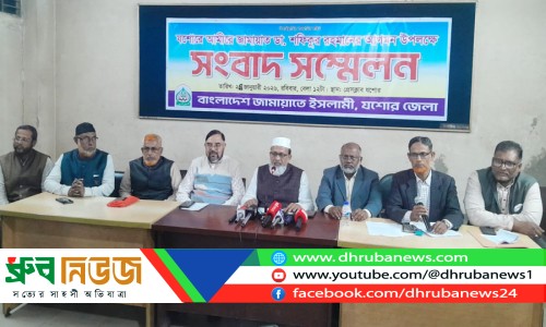বাংলাদেশ জামায়াতে ইসলামীর আমির ডা. শফিকুর রহমানের যশোর সফর ও নির্বাচনী জনসভাকে সামনে রেখে সংবাদ সম্মেলন করছে জেলা জামায়াত। ছবি: ধ্রুব নিউজ