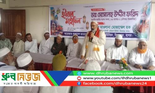 কুল্লা মাধ্যমিক বিদ্যালয়ের হলরুমে ইফতার মাহফিলে সংসদ সদস্য ডা. মোসলেহ উদ্দিন ফরিদ সংবর্ধনা দেওয়া হয়। ছবি: ধ্রুব নিউজ