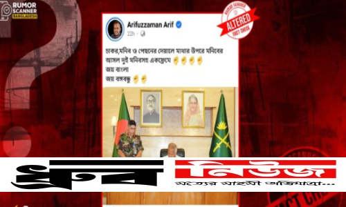 রিউমর স্ক্যানার টিমের অনুসন্ধানে জানা যায়, শেখ মুজিবুর রহমান-শেখ হাসিনার ফ্রেমবন্দি ছবির সাথে ড. ইউনূস ও ওয়াকার-উজ-জামানের ছবিটি আসল নয়। মূলত, সাম্প্রতিক সেনাসদর নির্বাচনী পর্ষদ উদ্বোধন অনুষ্ঠানে প্রধান উপদেষ্টা ও সেনাপ্রধানের একটি ছবি ডিজিটাল প্রযুক্তির সহায়তায় সম্পাদনার মাধ্যমে এই ছবিটি তৈরি করা হয়েছে।