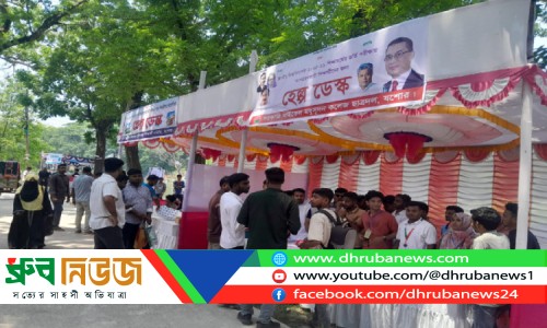 পরীক্ষার্থীদের সহযোগিতার জন্য যশোর সরকারি এম এম কলেজ কেন্দ্রে একটি ছাত্র সংগঠনের হেল্প ডেস্ক। ছবি: ধ্রুব নিউজ