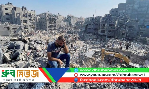 গাজার ধ্বংসস্তূপের মধ্যে বসে আছেন এক ফিলিস্তিনি। ছবি: সংগৃহীত