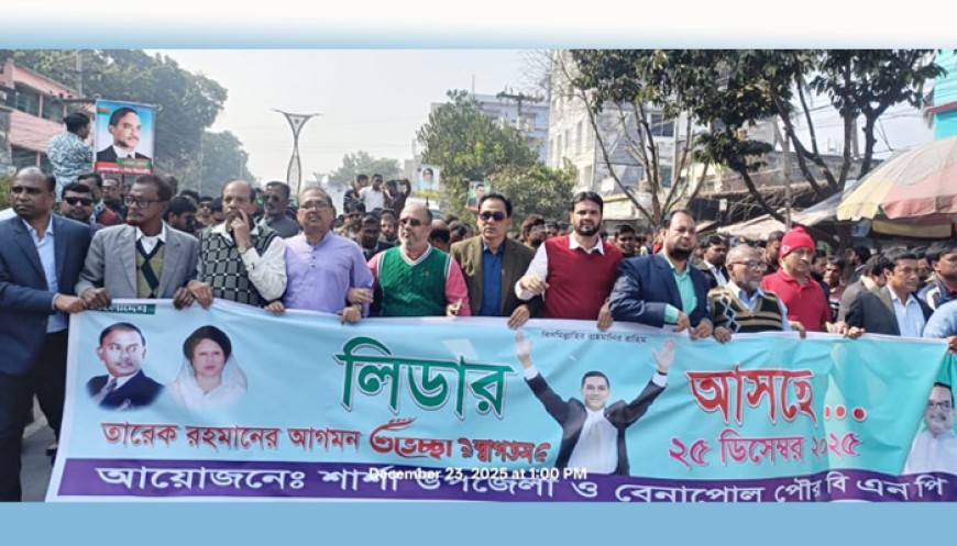 এদিকে, একই দিন দুপুর ১২টার দিকে বেনাপোলে তারেক রহমানকে স্বাগত জানিয়ে ‘লিডার আসছে’ স্লোগানে আনন্দ মিছিল করেছেন উপজেলা ও পৌর বিএনপির নেতাকর্মীরা। যশোর-১ (শার্শা) আসনে বিএনপির মনোনীত প্রার্থী ও সাবেক সংসদ সদস্য মফিকুল হাসান তৃপ্তির নেতৃত্বে বেনাপোল বল ফিল্ড থেকে মিছিলটি শুরু হয়। কয়েক হাজার নেতাকর্মীর অংশগ্রহণে মিছিলটি পৌর এলাকার গুরুত্বপূর্ণ সড়ক প্রদক্ষিণ করে।
