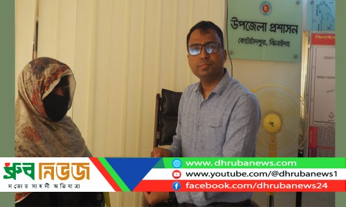 কোটচাঁদপুর উপজেলা নির্বাহী কর্মকর্তা (ইউএনও) এনামুল হাসান ইন্তাজুলের স্ত্রীর হাতে তুলে দেন নগদ অর্থ সহায়তা। ছবি: ধ্রুব নিউজ