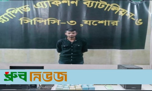 প্রায় সাড়ে ৪ লাখ জাল টাকা ও টাকা তৈরির সরঞ্জাম সহ ইব্রাহিম গাজী নামে এক যুবককে আটক করেছে র্যাব -৬ যশোর ক্যাম্পের সদস্যরার। বৃহস্পতিবার বিকেলে যশোর শহরের মনিহার সিনেমা হলের পাশের একটি চায়ের দোকান থেকে তাকে আটক করা হয়।