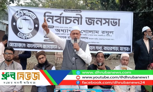 বাঘারপাড়া উপজেলার ধলগ্রাম ইউনিয়নে বিশাল নির্বাচনী জনসভায় বক্তব্য রাখেন জামায়াতে ইসলামী মনোনীত সংসদ সদস্য পদপ্রার্থী ও যশোর জেলা জামায়াতের আমীর অধ্যাপক গোলাম রসুল ছবি: ধ্রুব নিউজ